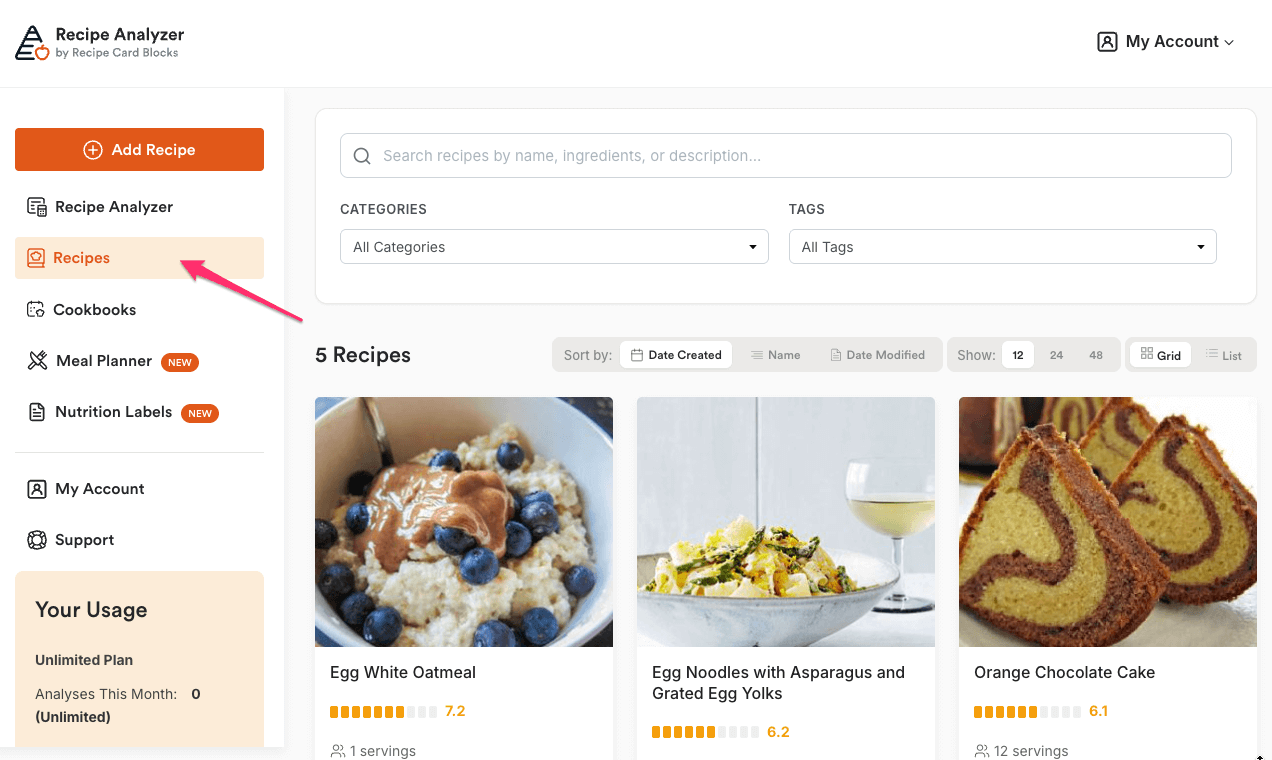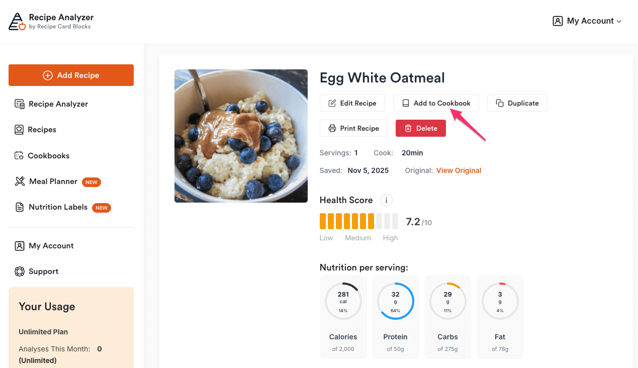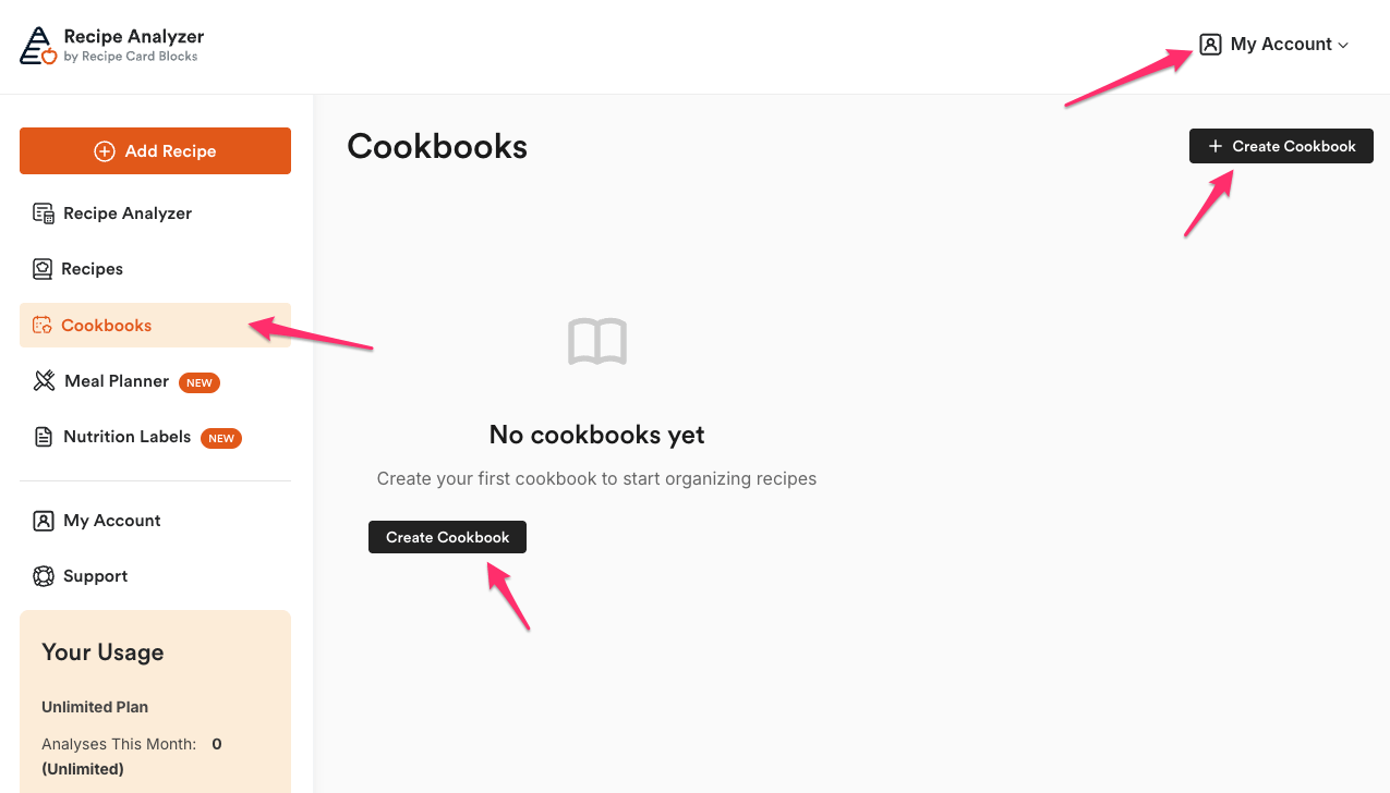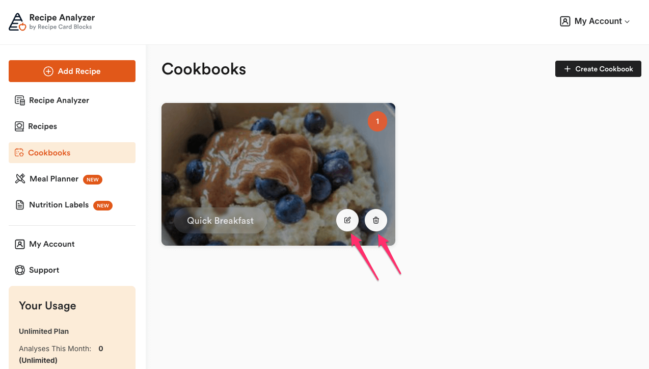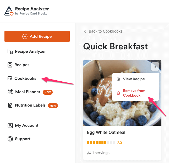 - Go to My Account → Cookbooks and click on the cookbook you want to delete the recipe from.