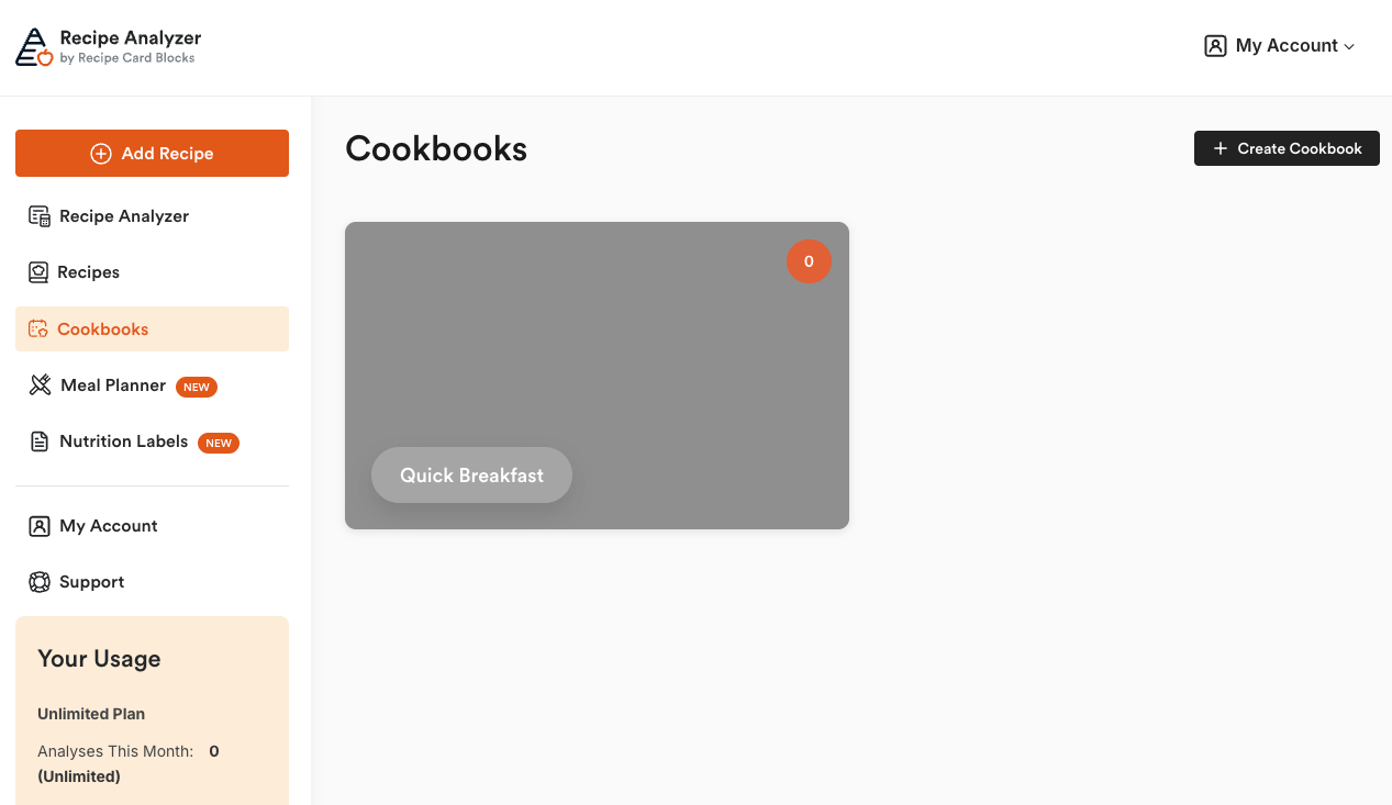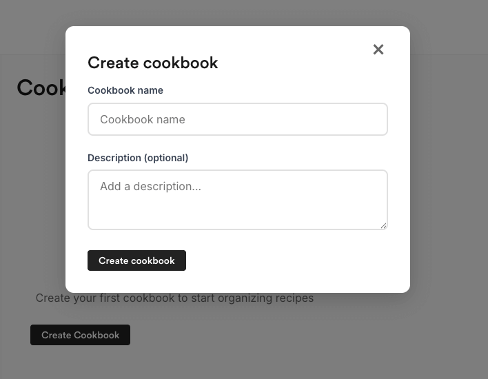 A Cookbook is a curated collection of your recipes organized around a theme (e.g., Weeknight Dinners, Vegetarian, or Holiday Baking). Cookbooks make it easy to plan and quickly find the right recipes without digging through your whole library.