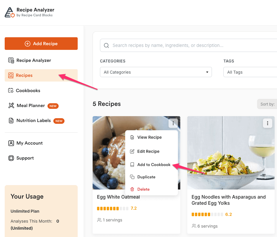 Note: To quickly add a recipe from the recipes library to a cookbook, click the three-dotted icon of the corresponding recipe, then click Add to cookbook. After this, follow all the steps from above.