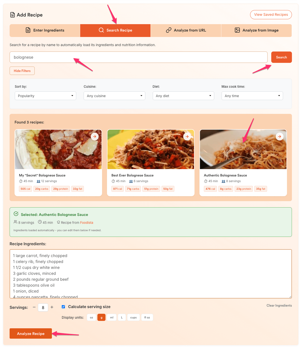 - Enter a dish name (e.g., bolognese, chicken alfredo) and click Search.