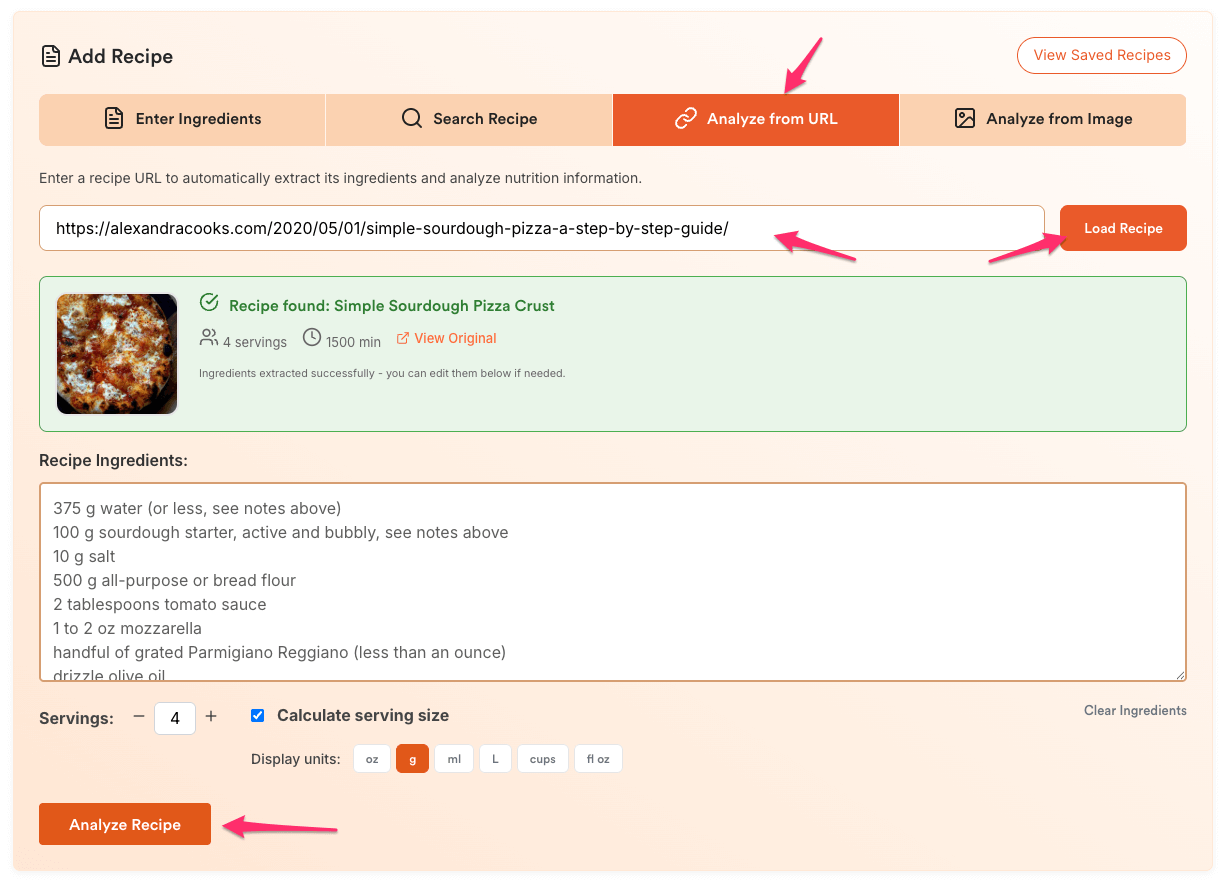 You can access the tool on the homepage and also from My Account by clicking on Add Recipe or Recipe Analyzer.
