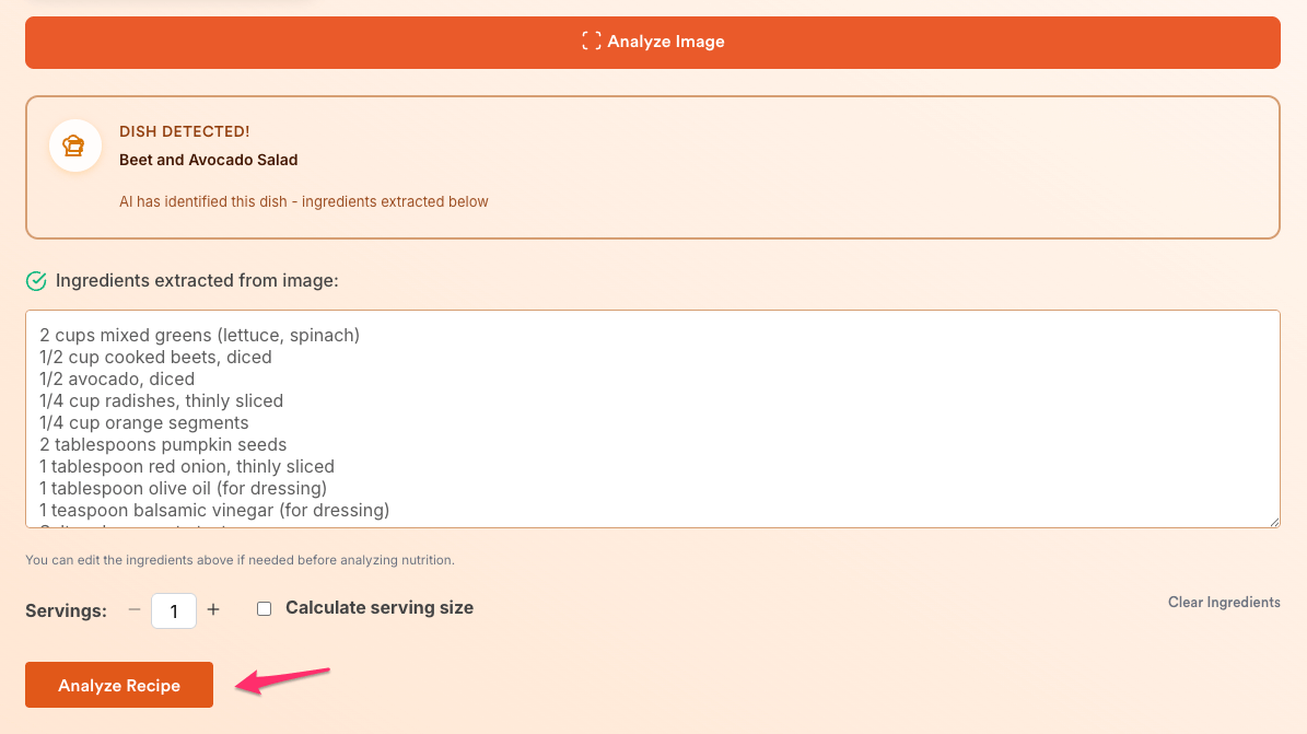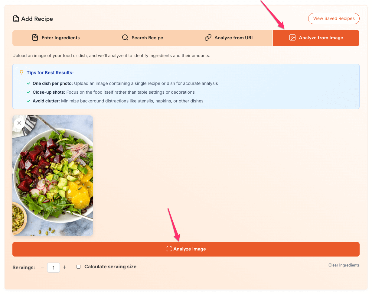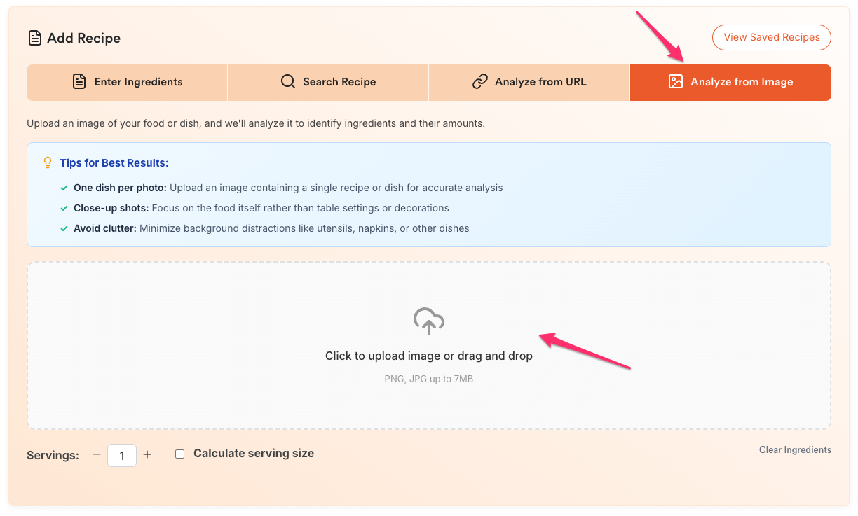 - One dish per photo: Upload an image containing a single recipe or dish for accurate analysis.